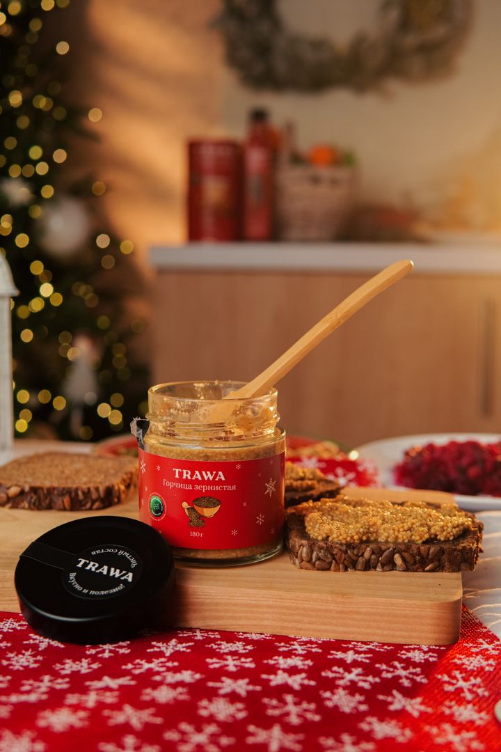 Зернистая горчица станет вкусным подарком (и с хорошим составом!) к новогоднему столу.