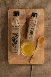 Сыродавленное кунжутное масло TRAWA имеет освежающий вкус и аромат с нотками молочного ореха. Цвет светлый, полупрозрачный. Консистенция легкая. Попробуйте!