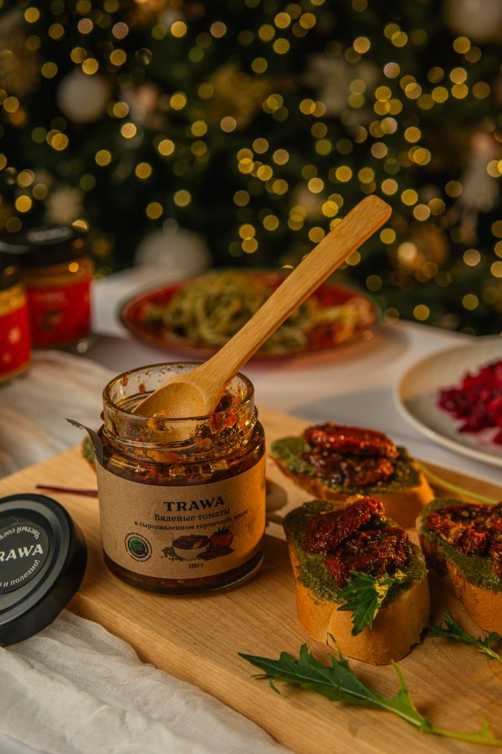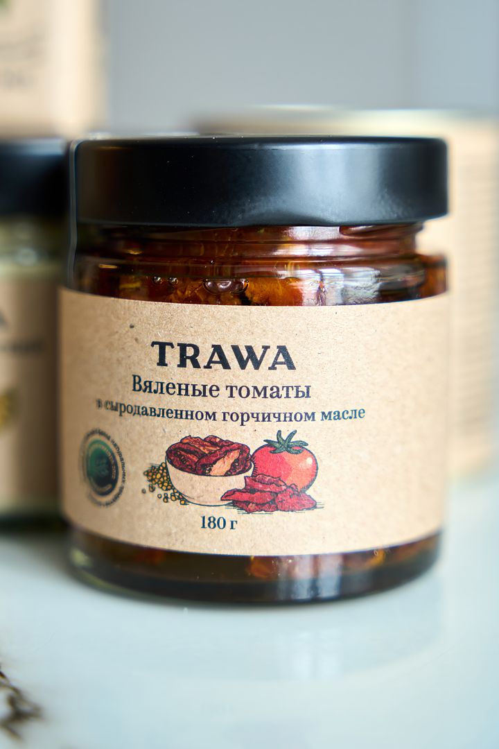 В составе — только томаты вяленые, сыродавленное горчичное масло TRAWA, соль, чеснок, специи.